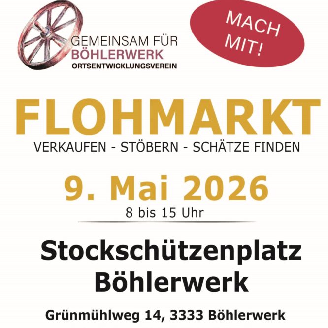 Stockschützenplatz Böhlerwerk, Grünmühlweg 14, 3333 Böhlerwerk Am 9. Mai 2026 lädt der Ortsentwicklungsverein Böhlerwerk zum Flohmarkt am Stockschützenplatz ein. Von